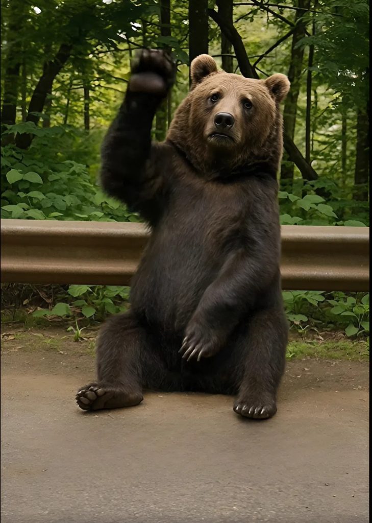 Byl to medvěd. Obrovský, s tmavě hnědou srstí, seděl na zadních tlapách hned vedle cesty. A to nejpodivnější – mával na mě přední tlapou. Ne náhodně, ale vědomě. Jako by mi chtěl něco říct.