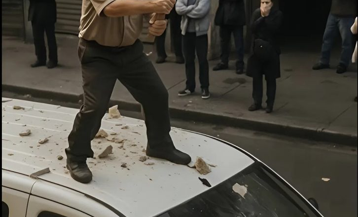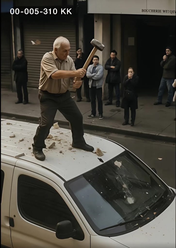 Na parkovišti před opuštěnou budovou stál muž – přibližně čtyřicet let – na střeše bílé dodávky a zuřivě do ní bušil těžkým kladivem. Každý úder se nesl daleko do okolí. Plech se bortil, sklo praskalo, karoserie se deformovala.