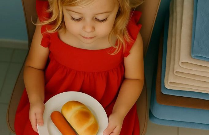 Z krabice jsem vytáhla dětskou plastovou židličku a talířek s párkem a chlebem.