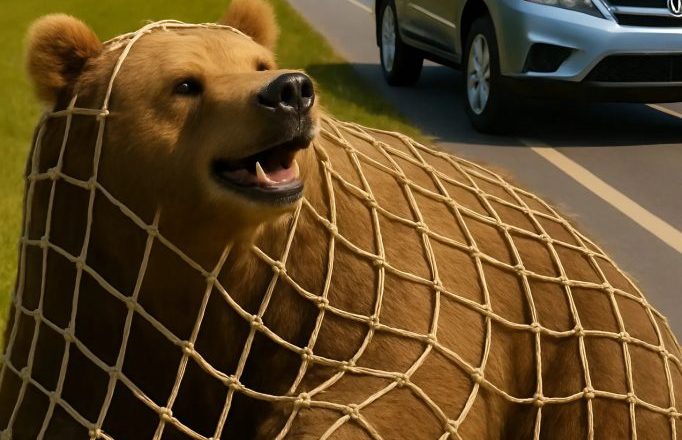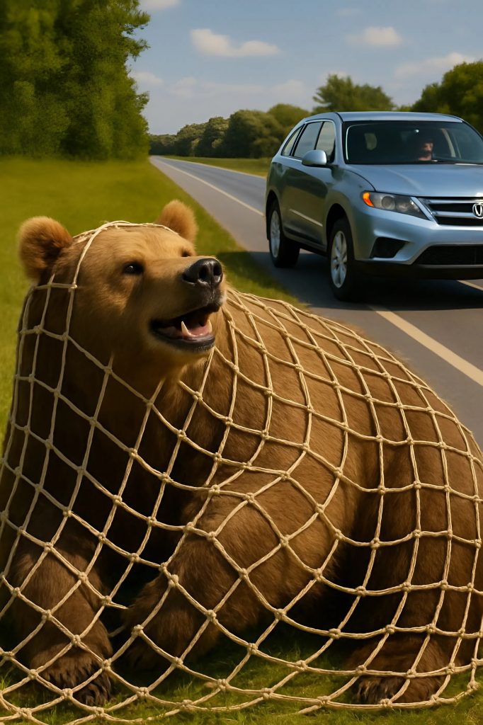 Nejprve jsem si všiml hnědé skvrny na krajnici. Myslel jsem, že je to stín nebo snad odpadky mezi keři. Ale když jsem se podíval lépe, ztuhl jsem: byl to medvěd. Obrovský, silný… a přesto naprosto bezmocný. Jeho tělo bylo zamotané v husté síti, provazy mu řezaly srst a tlapy. Těžce dýchal, řval bolestí, a ten zvuk nebyl výhrůžka – byl to prosba o pomoc.