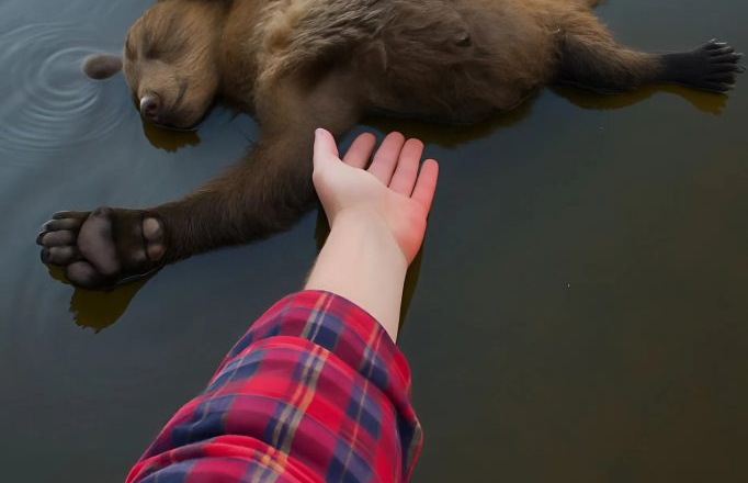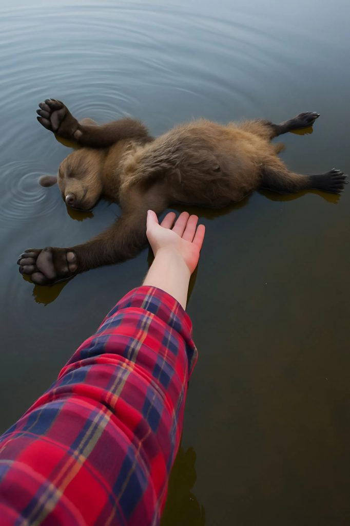 Šel jsem podél divoké řeky, když mě pohled zachytil na něčem zvláštním — na hladině vody se pohupovalo drobné tělíčko medvíděte. V tu chvíli se mi zatajil dech. Proud byl silný a neúprosný, plný naplavených větví a studené horské vody, která hučela mezi kameny jako rozzuřené zvíře. Ale přesto tam to malé stvoření bylo – bezmocné, klidně se kolébající jako list ve větru.