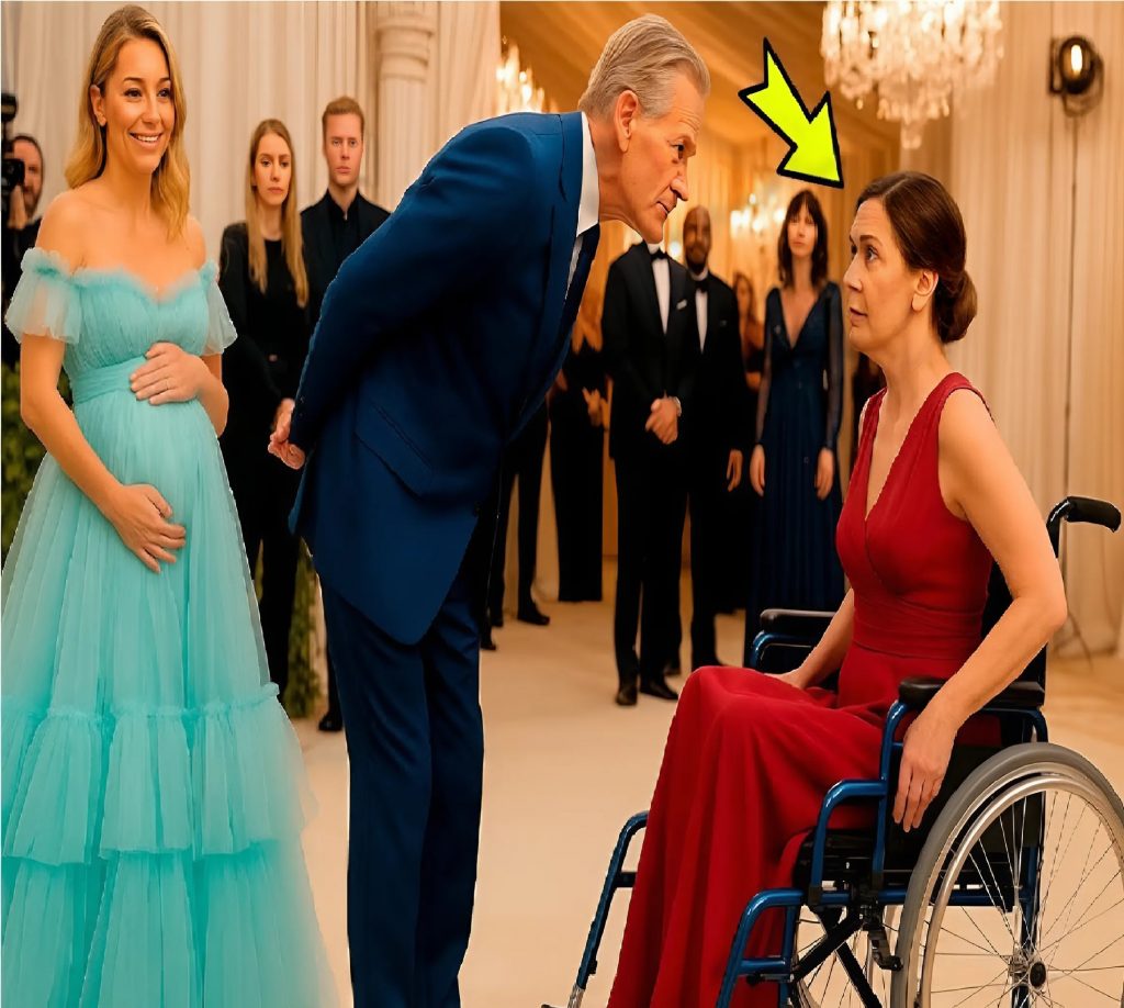 Na fotografii se muž v modrém obleku sklání k ženě na invalidním vozíku. Ona – oblečená v elegantních červených šatech – sedí klidně, ale v jejím pohledu je něco mnohem hlubšího. Vedle něj stojí mladá žena v tyrkysových šatech – očividně těhotná – a usmívá se, zatímco si hladí břicho.