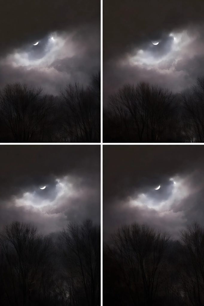 Zachycuje úzkou cestu vedoucí kolem našeho domu směrem k lesu. Na jedné straně je starý dřevěný plot, na druhé husté keře. V dálce je vidět lampa, která tam stojí už roky a téměř nikdy nesvítí. Nic víc. Žádní lidé, žádný pohyb.