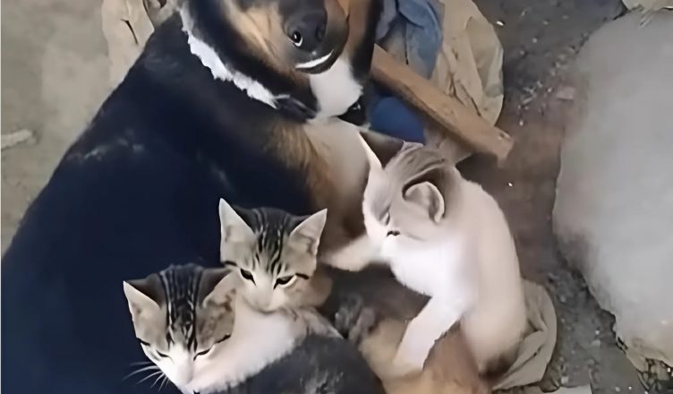 Pod starými kusy plastu a hadry se chvěla tři malá koťátka. Sotva narozená. Sotva živá. A kolem nich — pes. Stočený, s tělem jako štít, ocasem přes ně a čumákem na jejich malých hlavičkách.