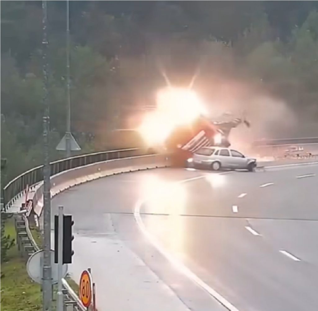 Na záběrech je patrný nákladní vůz DAF jedoucí v pravém pruhu. Přívěs je naložený stavebním materiálem. Náhle se kabina prudce zachvěje. Řidič ztrácí kontrolu, kamion kličkuje, najíždí do středového pásu a pak ostře zatáčí vlevo. A v ten moment — neuvěřitelné.