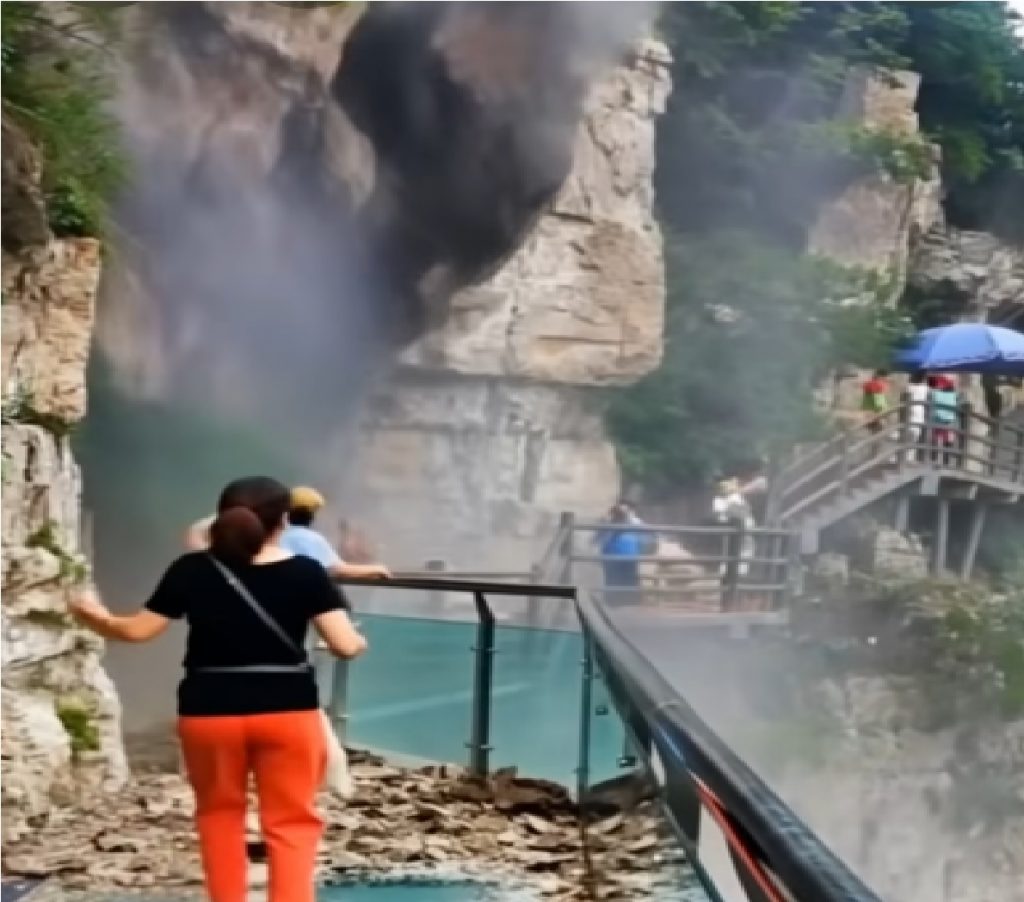 Různě velké balvany s hrozivým rachotem sjížděly po svahu přímo směrem k mostu. Lidé reagovali instinktivně – křik, běh, snaha ukrýt se. Vznikl chaos. Někteří se pokoušeli utéct ke krajům mostu, jiní zůstali paralyzovaní strachem. Průvodci se snažili situaci zvládnout a křičeli na přítomné, aby se drželi dál od okrajů a skrčili se.